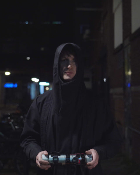 I am more than just_ a coat. Let mi be your shelter, your cocoon, your defender. This coat is made from flame retardant, water- and splatter proof A grade military fabric of the Dutch company TenCate. Designed with an abundant silhouette, an adjustable hood that can cover a helmet and two magnetic openings to unleash your own arms. I am made to be your shelter and mi_defender has no gender. This is mi longer version using 3.5meter of fabric, 10 meter bonding tape and I am stitched with aramid yarns to not fall apart.